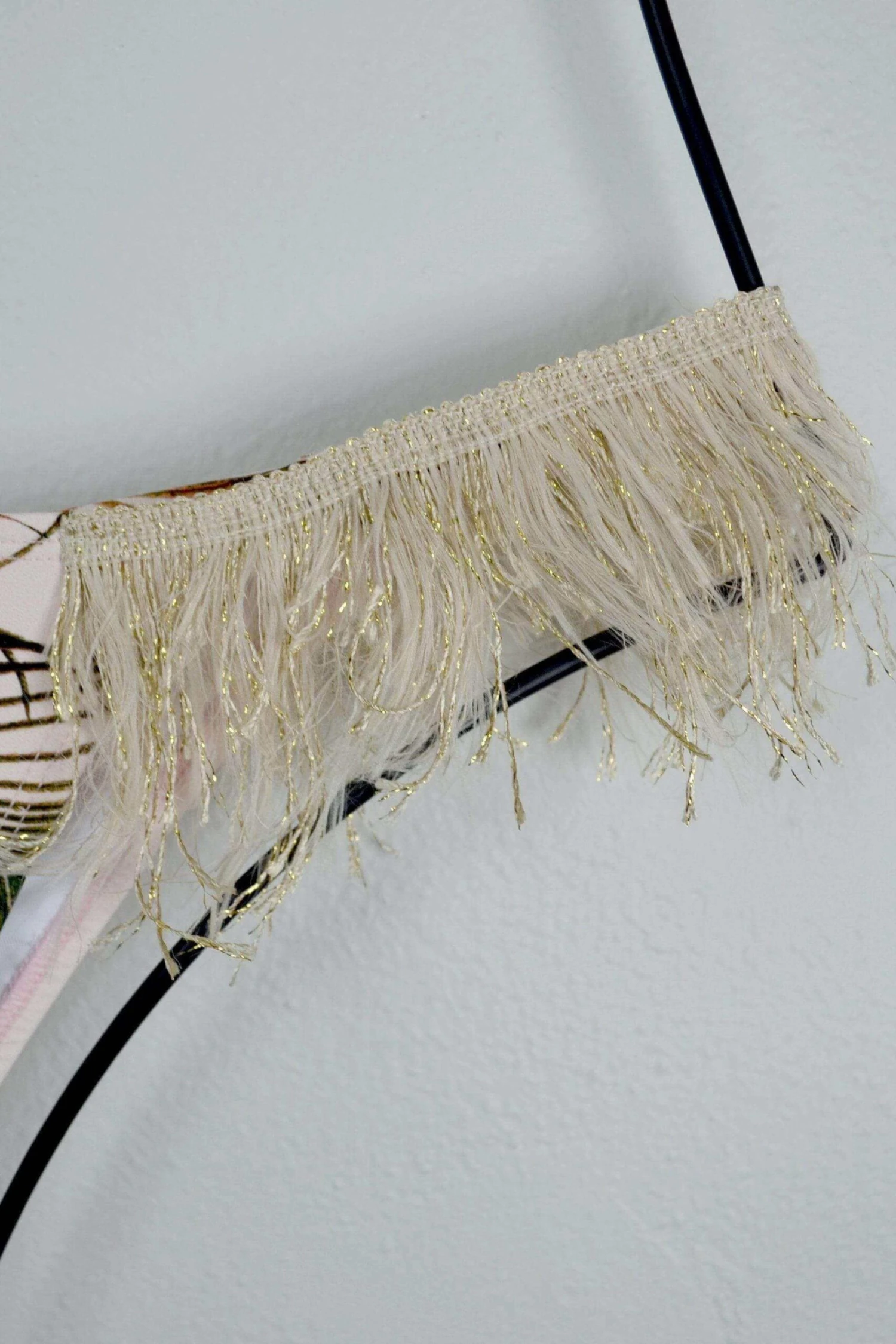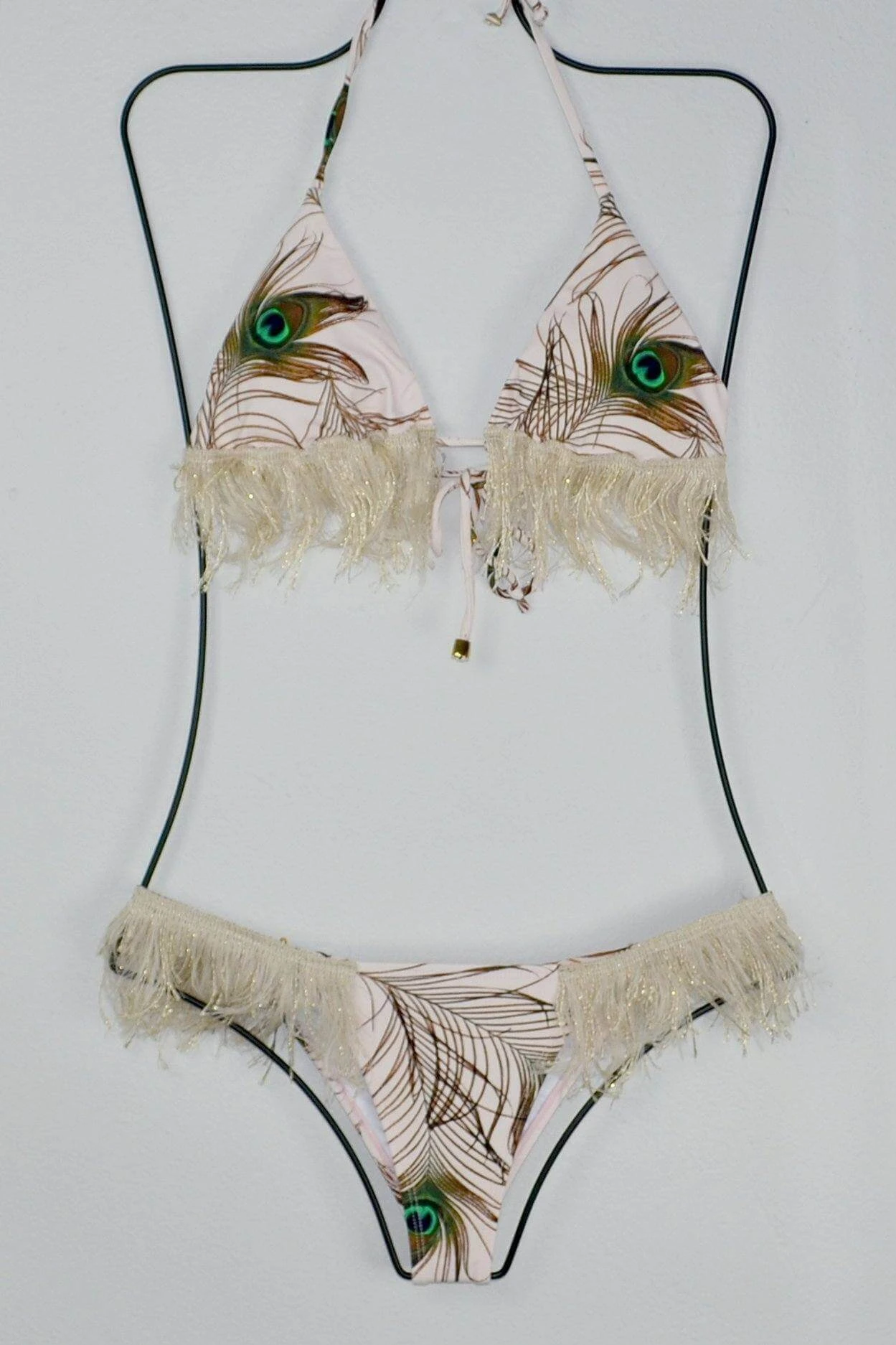 This ultra luxurious and exotic bikini is made of fine Italian fabric. The triangle top is exclusive in this stunning feminine and exotic print with unique plumage fringes in natural tones. The top also features removable pads. The bottom is a string style also finished in unique plumage fringes in natural tones. The rear is a cheeky coverage. Seamless. Fully lined.
