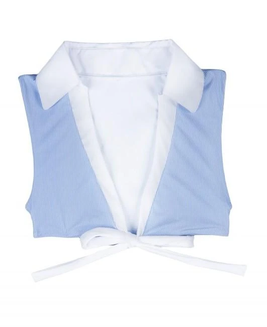 This is one of our fav’s. This ultra luxury top features a wrap around with Riviera Stripe fabric. The top has a cute white collared and lapel-like look. Dazzle for days in this one!!