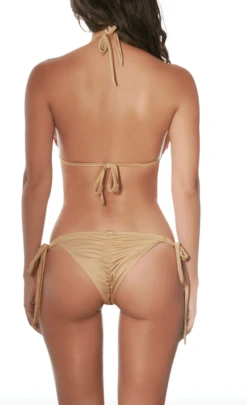 This gorgeous handmade bikini incorporates multi-colored Murano glass beaded straps with gold connectors on the top and bottom. The luxurious electric blue fabric glistens as it wraps around your contours. Cheeky scrunch detailing in the rear.