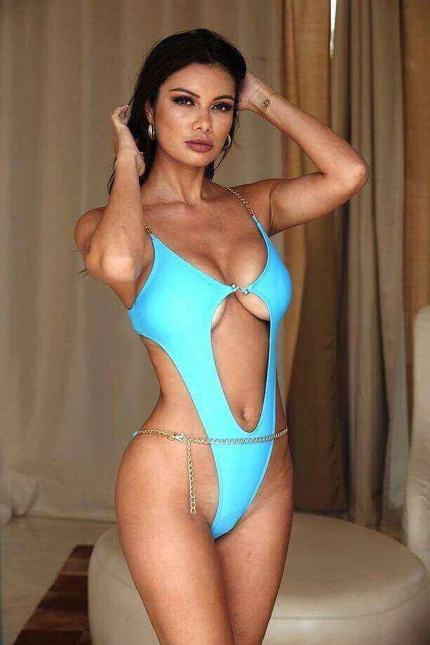 A beautiful earth-tone bikini provides a beautiful gold chain around the waist and shoulders. A perfect touch of class to the organic look.
