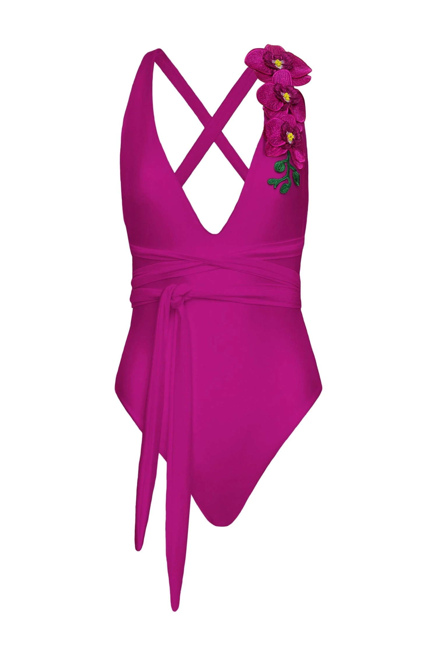 A plunging neckline adds allure to a sultry Oncidium swimsuit featuring a cutout neckline with 3D orchid embroidery and crisscrosses ties at the waist.