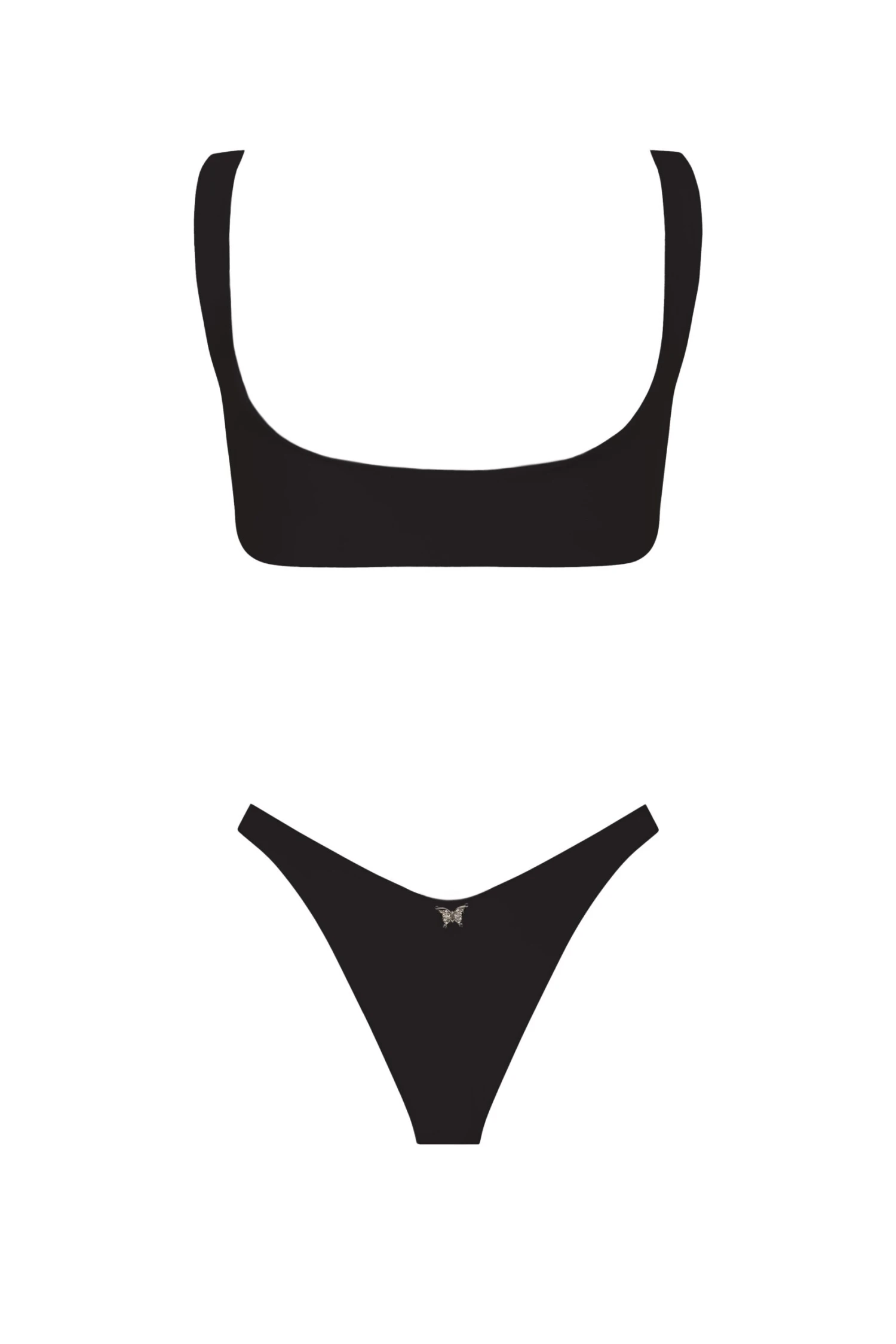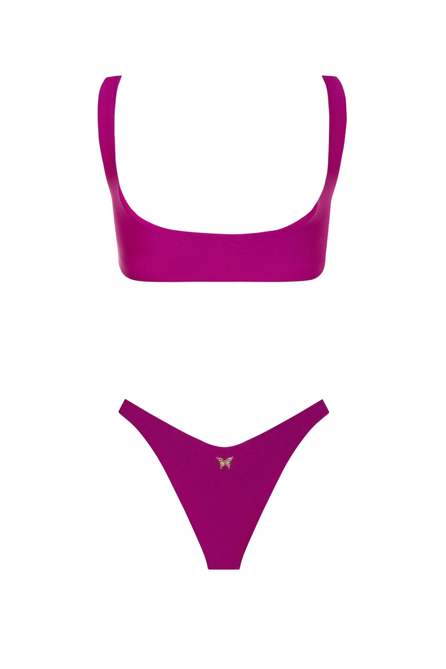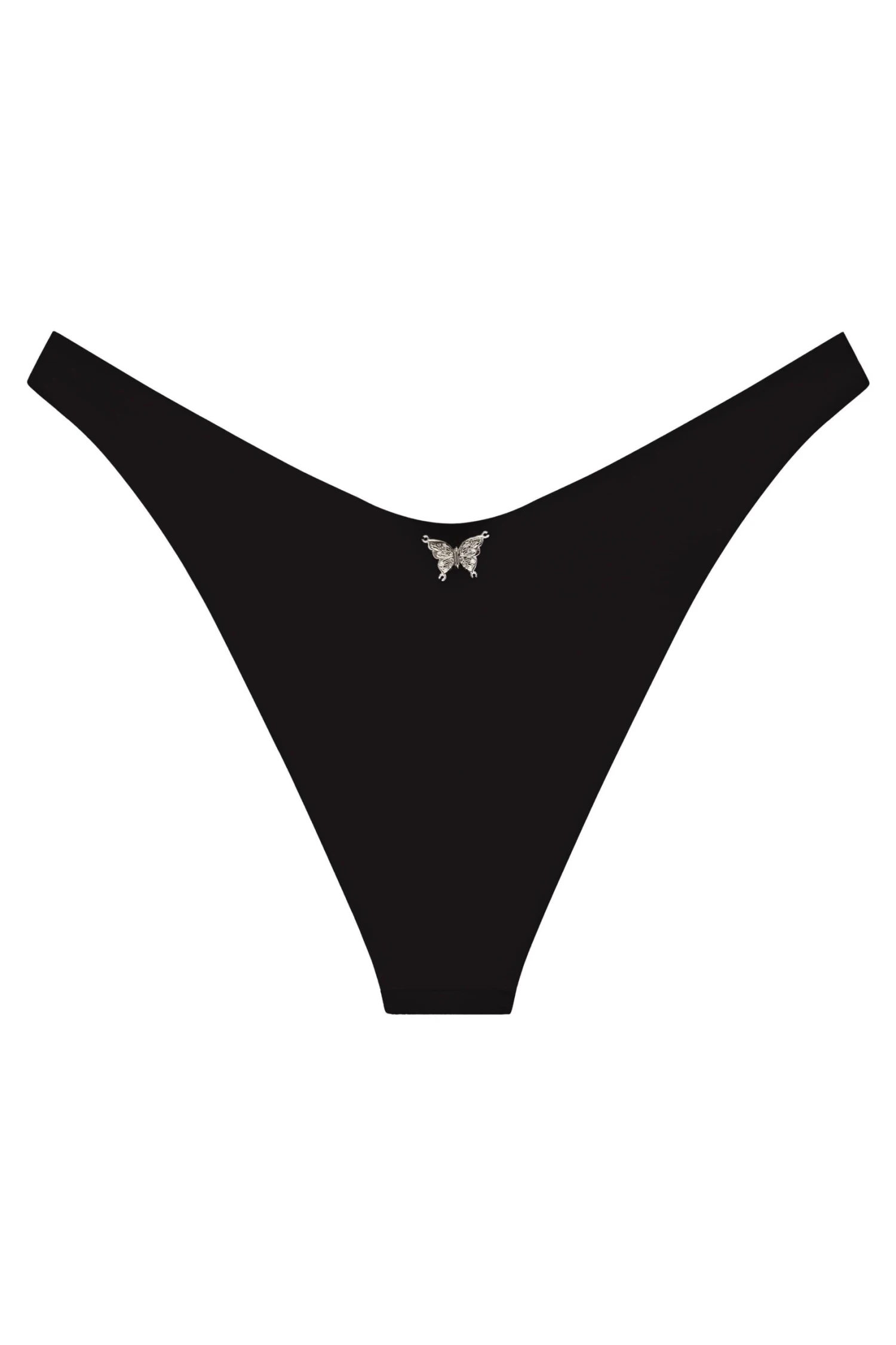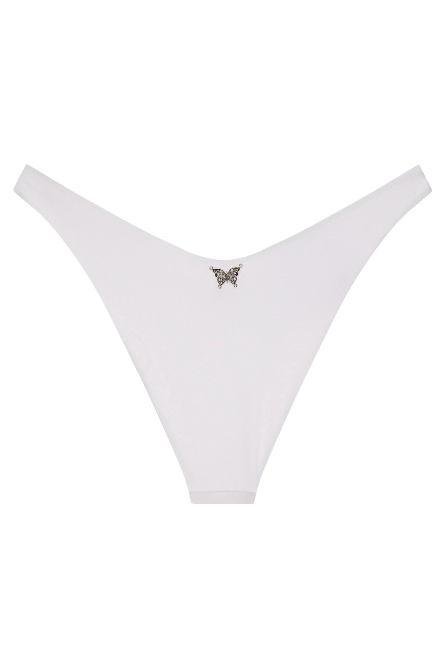 This bottom has a V-shape at the frond and back with seamless stitching and 3-D orchid embroidery on the side.