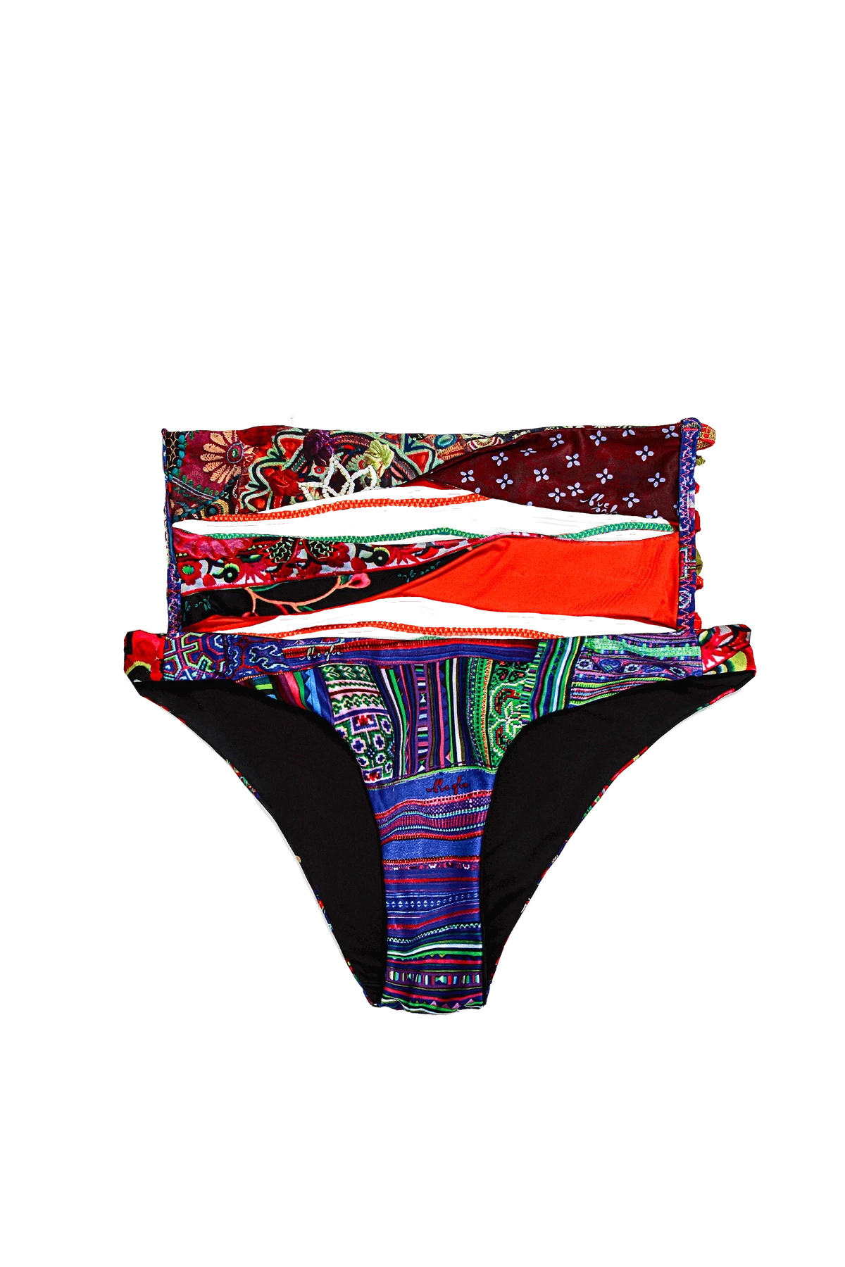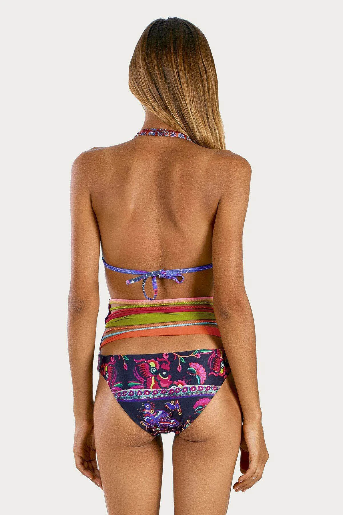 the high waist cut, colorfully twisted front bands on these 2 n’1 fully reversible bottoms extend into a multitude of brightly colored straps around the back.